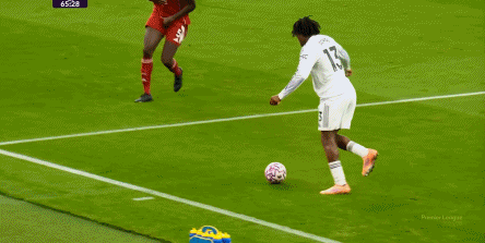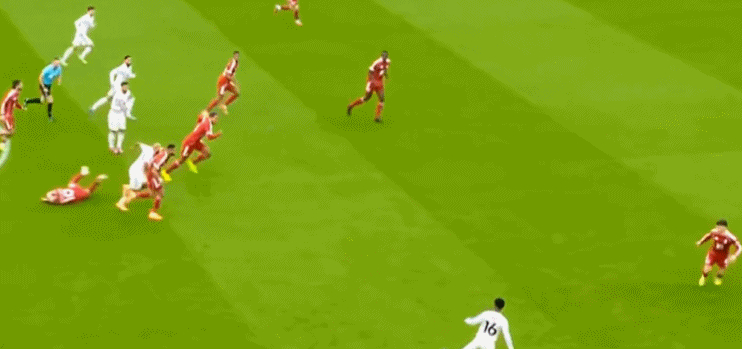 緊接著,左路的一次類似的配合推進,沒有打出威脅,直接變成了危險,從而迫使卡塞米羅伸腳犯規,染黃抽筋: