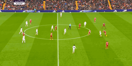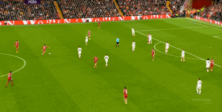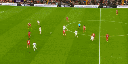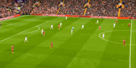這樣一來,你才能看到庫尼亞一直回撤到中圈接球,銜接斜向轉移,通過倒三角線路捕捉利物浦雙后腰防守問題的這一腳中柱的射門: